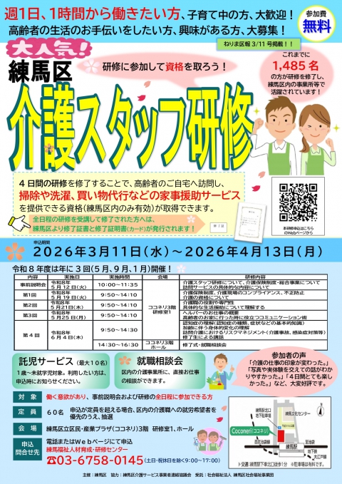 買い物代行などの家事援助サービスを提供できる資格(練馬区内のみ有効)が取得できます。