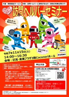「安心♪サポート訪問ヘルパーセミナー」を開催します。 日時: 令和7年11月15日(土)14:00~16:30 場所: 練馬区立区民・産業プラザ3F Coconeriホール 第1部 安心♪サポート訪問ヘルパーセミナー (14:00~15:00) 有資格者...